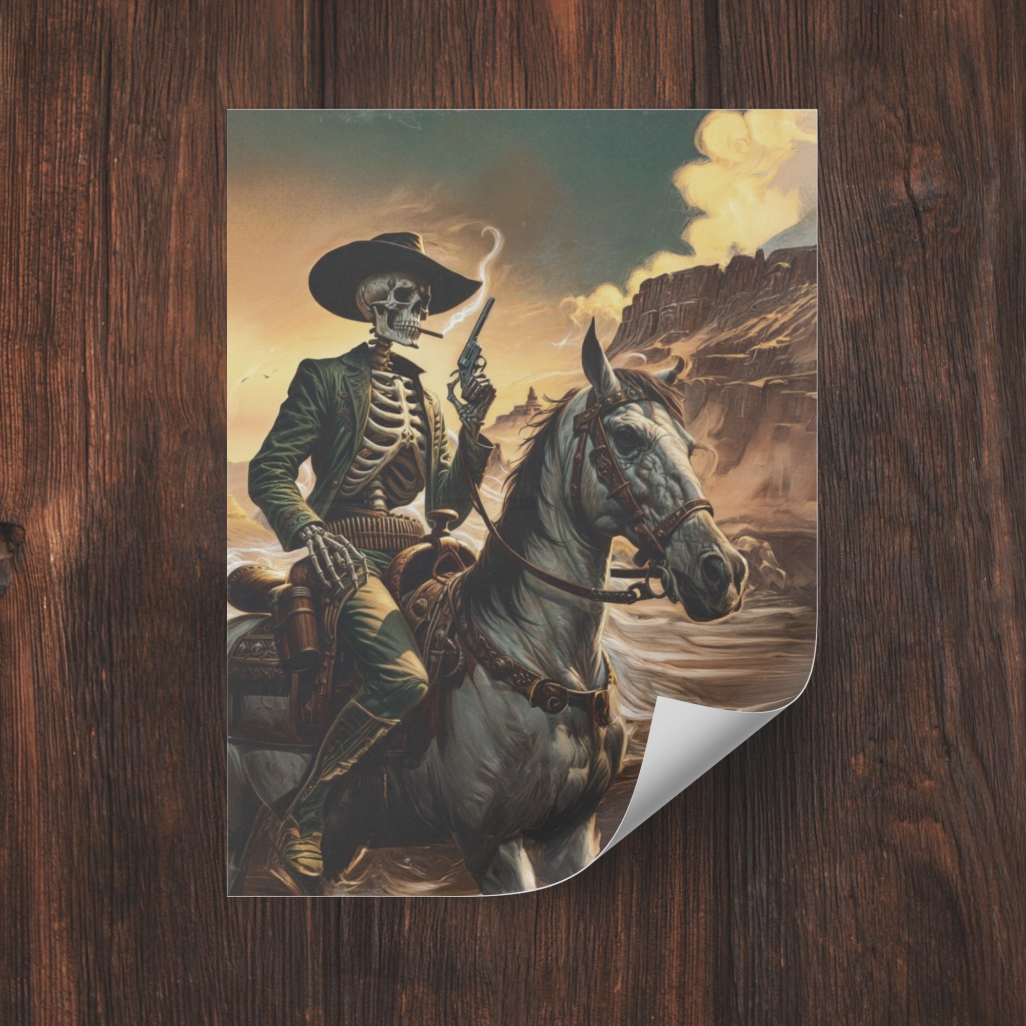 Vintage-inspired satin or archival matte posters featuring a smoking cowboy skeleton riding a pale horse in retro western style. Perfect for fans of the wild west and those who appreciate unique and edgy artwork. Ideal for Halloween decorations or western-themed parties.